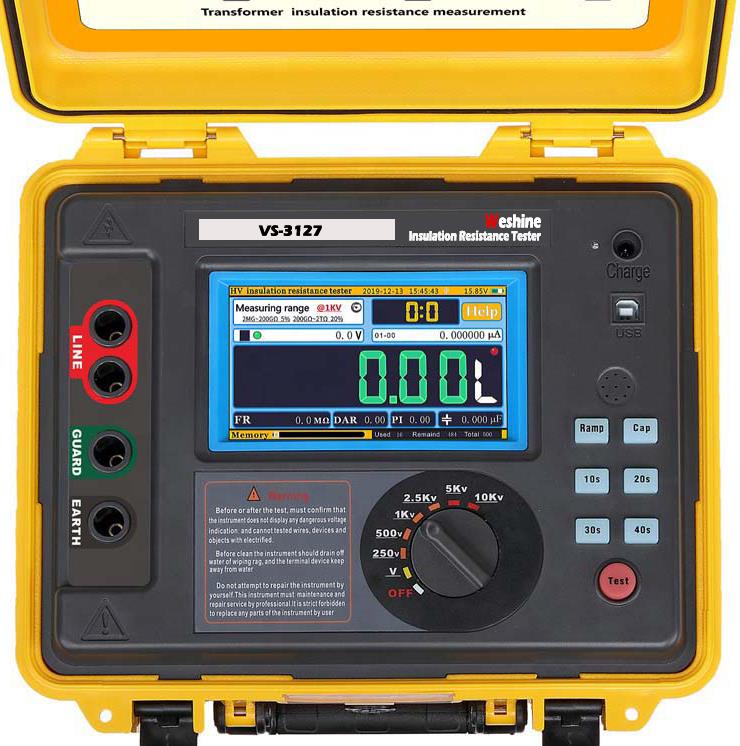VS-3127 VS-3127ट्रान्सफर्मरको इन्सुलेशन परीक्षण30 TΩ को अधिकतम प्रतिरोधको साथ 15 kV परीक्षण भोल्टेज सम्म सही इन्सुलेशन प्रतिरोध मापन गर्ने क्षमता प्रदान गर्दछ। प्रतिरोध मापन शुद्धता ± 5% 1 MΩ देखि 3 TΩ हो! उपयोगिताहरू र सेवा कम्पनीहरूका लागि VS-3127 यसको लचिलोपन र भविष्यको प्रमाणीकरण क्षमताको साथ एक चौतर्फी परीक्षक हो। Weshine VS-3127 तपाईं जहाँ काम गर्नुहुन्छ त्यहाँ काम गर्न डिजाइन गरिएको हो। आउटपुट रेटेड भोल्टेज अधिकतम पहुँच 7 गियरहरू (250V, 500V, 1KV, 2.5KV, 5KV, 10KV, 15KV)। अधिकतम सर्ट सर्किट वर्तमान 7mA इन्सुलेशन प्रतिरोध परीक्षण (IR), ध्रुवीकरण सूचकांक परीक्षण (PI), डाइलेक्ट्रिक अवशोषण अनुपात परीक्षण (DAR)। र्याम्प परीक्षण मोड (RAMP), फिल्टर प्रतिरोध परीक्षण मोड (FR)। * क्षमता परीक्षण (क्याप।)। भोल्टेज मनिटर प्रकार्य, स्वचालित रूपमा मापनको प्रत्यक्ष भोल्टेज निगरानी